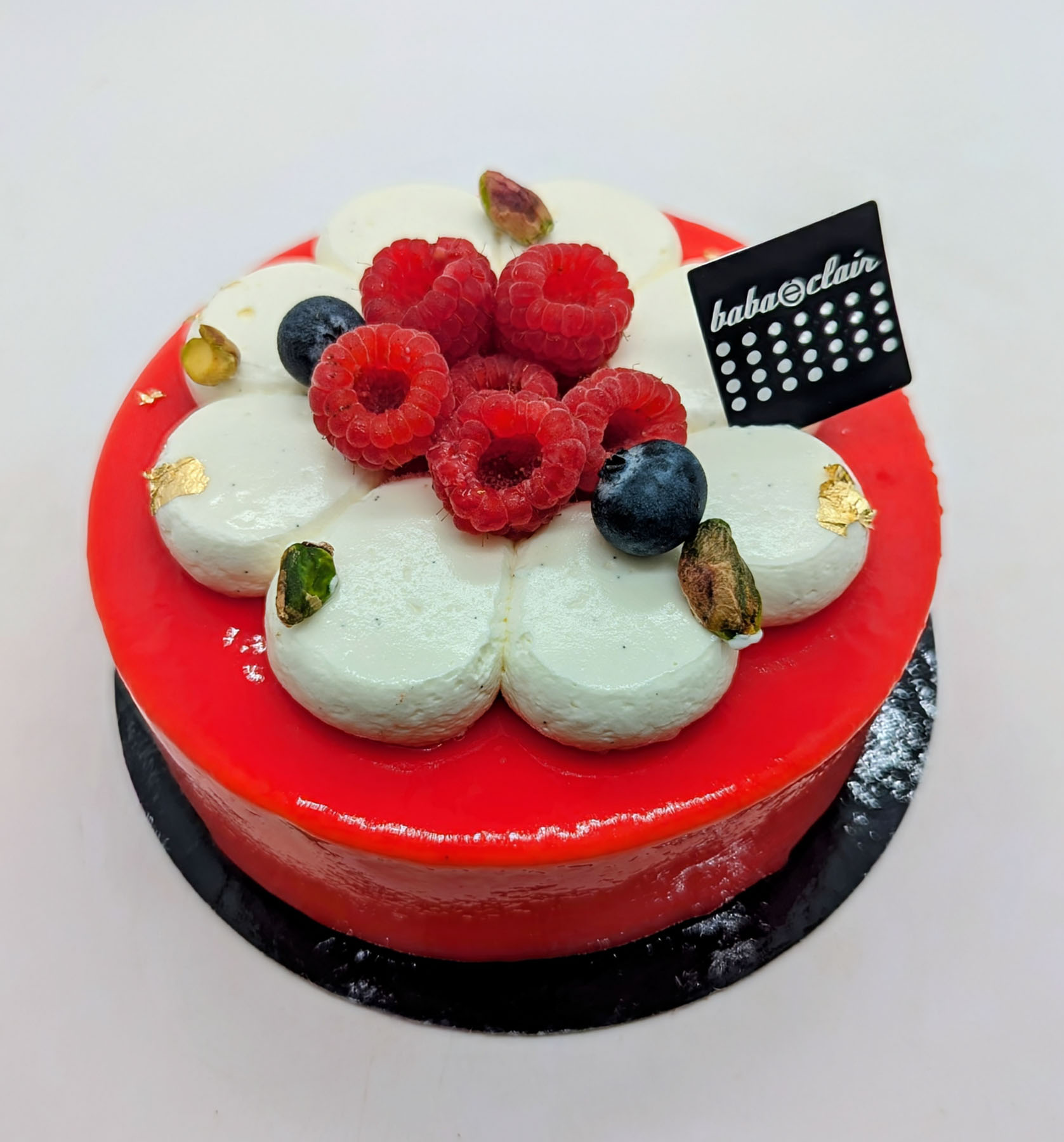 Mousse légère vanille Tonka, cœur crémeux aux fruits rouges, croustillant amandes et pistaches, biscuit madeleine.
