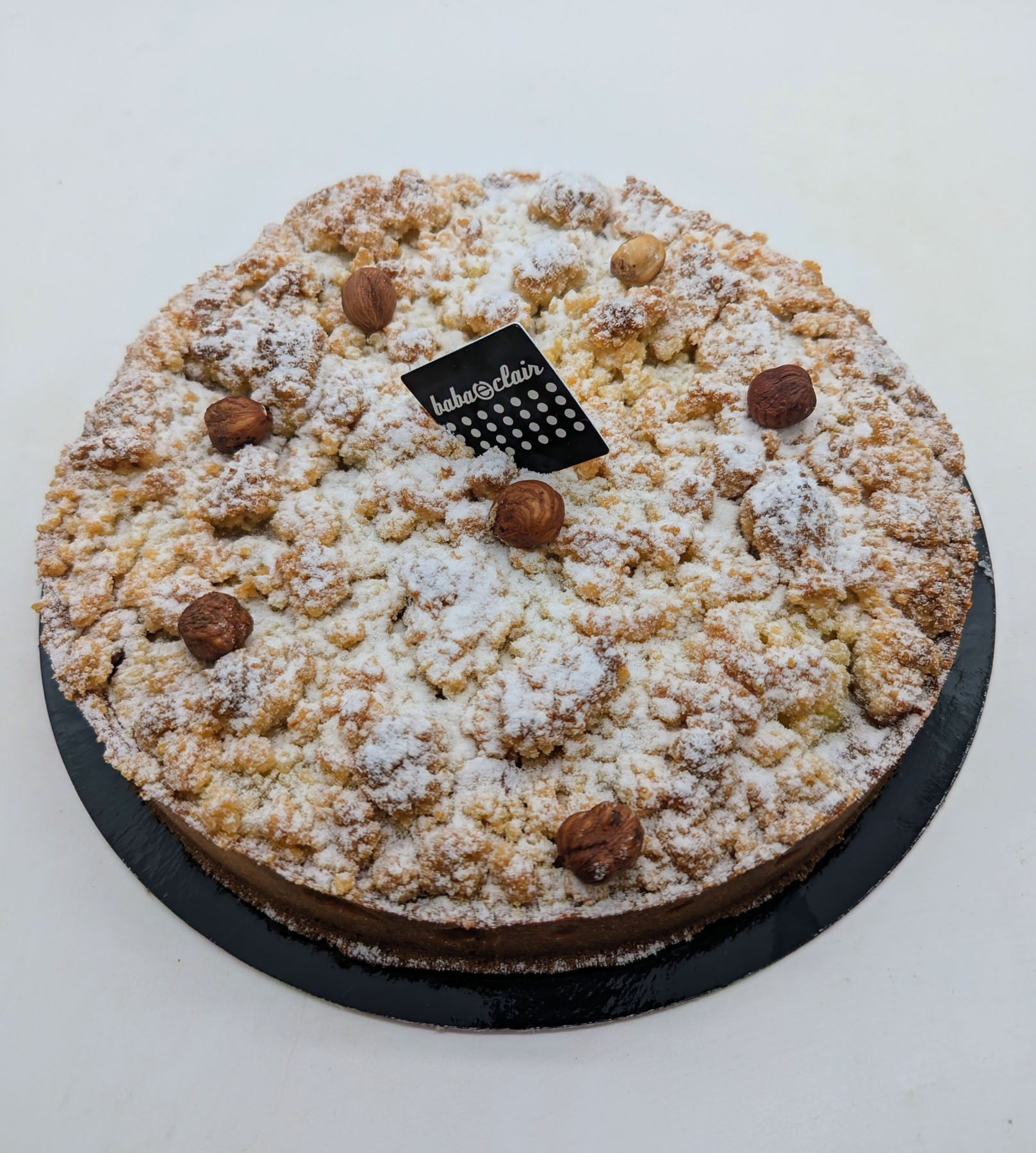 Pâte sucrée, crème d’amande, pommes, caramel et crumble