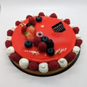 Pâte sablé, biscuit génoise  Au choix :  Ganache vanille, praliné ou chocolat. Décors fruits rouges ou chocolat  (Uniquement 6, 8, 10 ou 12 pers).