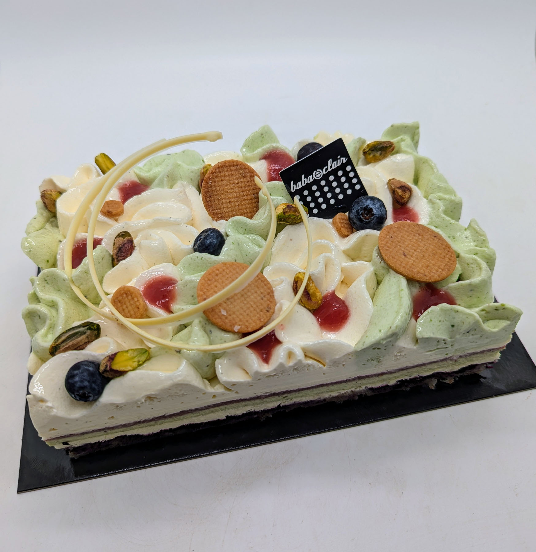 Eclair chocolat / Eclair café / 3 tartelettes aux fruits (selon les fruits de saison) / Chou fruits rouges / Paris Brest / Mini baba au rhum / Cake praliné / Cake pistache - framboise.