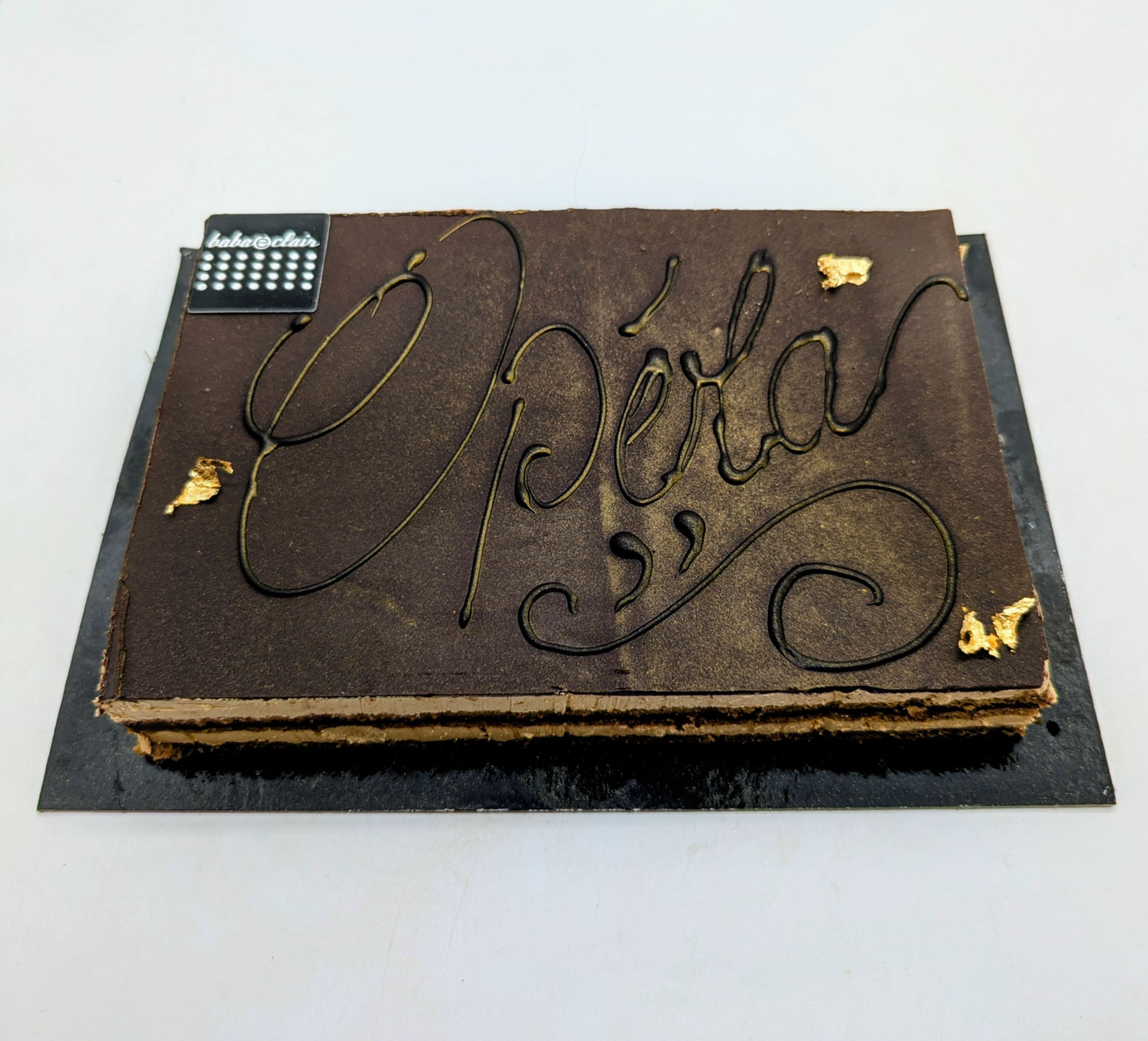 Biscuit Joconde, crème au beurre café, ganache chocolat et glaçage chocolat.